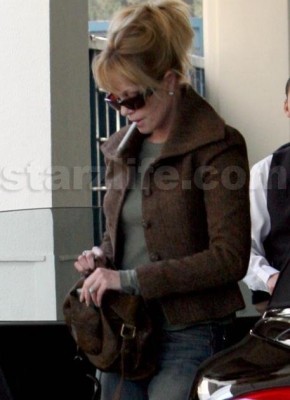 Check out these StarzLife Exclusive photos of Melanie Griffith smoking a big ugly cigarette before going into an appointment in Beverly Hills. The thing was freshly lit when she got out of her car so she had to suck it down as fast as possible! Nothing like the quick fix eh Mel?