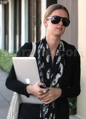 Here’s Starzlife fave Nicky Hilton wearing an Alexander McQueen scarf, taking her computer into the shop. Technically, that’s shopping. Nicky recently helped big sis Paris ring in her 29th birthday at the Tea Room in New York, as well as attending the launch of Butter NC, a new bi-level dance club in North Carolina.