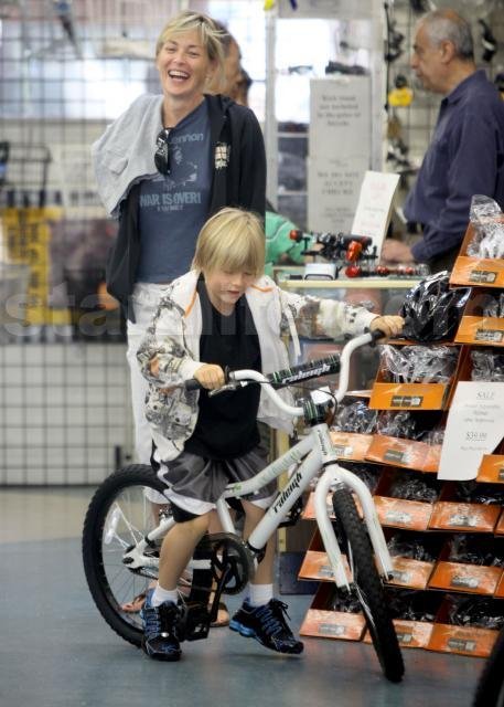 Sharon Stone spent some time with her son Roan this past weekend while he learned to ride his bike. Sharon walked along side as he peddled the bike still with training wheels and instructed him on using the breaks.