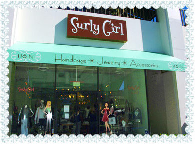http://www.shopsurlygirl.com/ “high end. high maitenance.”The Hottest Accessories… The Hottest Street…116 North Robertson Blvd, Ste A, Los Angeles, CA 90048Alison Muh’s Surly Girl on Robertson Blvd. is every girl’s dream of a shoppe. Chock full of delicious handbags and delicate jewelery, this little piece of heaven is frequented by celebs such as Britney Spears, Brooke Burke, Kristen Cavallari, Joely Richardson, Portia de Rossi, Eva Longoria, Hayden Panetteirre, and Nicolette Sheridan.What Surly Girl has to say about herself:“From the Desk of the C.F.O. Chief Fashion Officer …Once upon a time, our founder and original Surly Girl, Alison, had what most people would refer to as a “real” job. The problem with this is that you have to take orders from someone else. And, that someone else is often an idiot.In Alison’s case, when she wasn’t chained to her desk, she was sleeping underneath it on an air mattress. (This is not a joke.) Yet she somehow managed to survive working on Wall Street in her 20’s. Okay, the vodka may have helped. The point is, she worked for a lot of screamers. Unfortunately, the surliness she displayed when talking back to them did not go over well. Lessons in tact apparently did not come with her Ivy League diploma…And so on she went in pursuit of a career that would embrace her inner surliness. Where she could be her own boss, and justify shopping in the middle of the day. Hence Surly Girl Studios (and a hot pink briefcase that sparkles) was born in 2002!Very quickly, our Surly products started showing up on movie premiere and award show red carpets. They were spotted on Surly shows like “Desperate Housewives” and were constantly being photographed by the paparazzi on the arms of Surly Girls like Britney Spears, the Hiltons, and Kristin Cavallari, just to name a few. By December 2005, demand quickly drove us to open our first Surly Girl boutique on the famous (and sometimes infamous, just like a Surly Girl!) Robertson Blvd. Directly across from the one-and-only Ivy restaurant, of course.Today, our Surly Girl brand, designed by Alison and proudly made in the USA, has expanded from our signature handbags and evening clutches to include Surly wristlets, headbands, wallets, belts, cuffs, leather goods, Swarovski bedazzled accessories, Surly soy candles and Surly loungewear. Visit our Surly Girl flagship store the next time you are in Hollywood, and get Surly! “