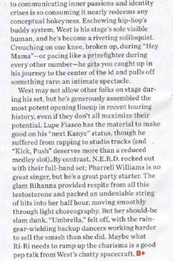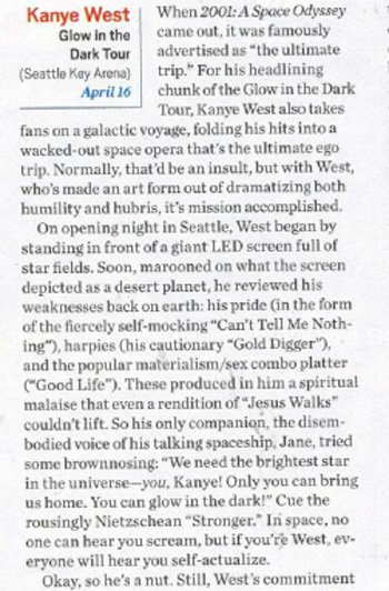 Kanye West published a hate filled rant on his blog yesterday aimed at Entertainment Weekly for their review of his Glow in the Dark tour. The words speak for themselves, click to view. Not safe for the juniors.“Yo, anybody that’s not a fan; don’t come to my show. For what?! To try and throw ya’ll two cents in? Ya’ll rated my album shitty and now ya’ll come to the show and give it a B+. What’s a B+ mean? I’m an extremist. It’s either pass or fail! A+ or F-! You know what, fuck you and the whole fucking staff!!! I know I shouldn’t dignify this with a comment, but the reviewer threw a jab at all the artists. I just wanna know when was the last time you enjoyed yourself. If you can’t have fun and lose yourself at this tour it’s a good chance you’re a very miserable person. I actually feel sorry for you guys. Your job forces you to not have fun anymore. Grab a drink, holla at some nice girls, and party bitch!! You don’t know shit about passion and art. You’ll never gain credibility at this rate. You’re fucking trash! I make art. You can’t rate this. I’m a real person. I’m not a pop star. I don’t care about anything but making great art. Never come 2 one of my shows ever again, you’re not invited and if you see me…BOW!! This is not pop, it’s pop art!”Kanye is no stranger to speaking out on things he is passionate about. Sometimes it’s inappropriate but in this case, He may be justified to stick up for his work. In reality though, I went through 18 years of schooling, and I was throwing parties when i got a B+.Get em’ Ye!you can read EW’s review by clicking on these scans!