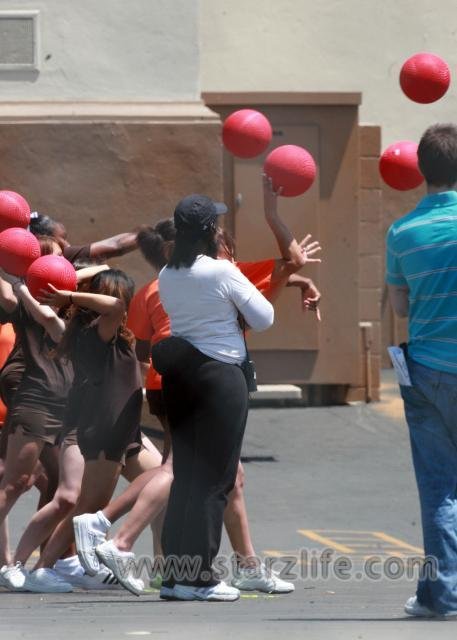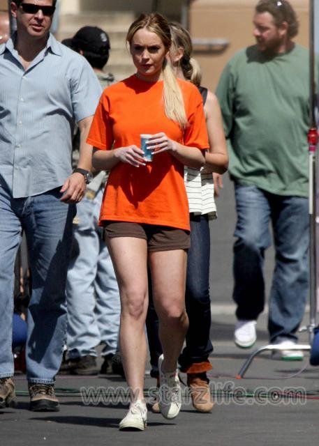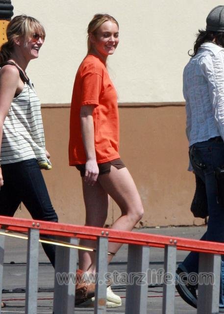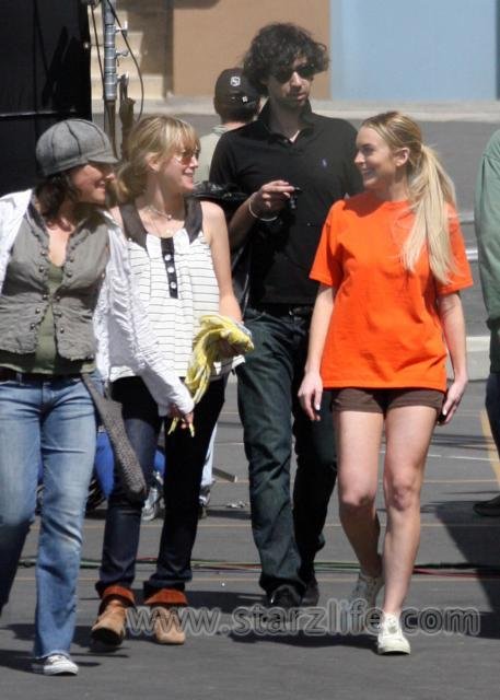 Lindsay, dressed in some sort of a PE type uniform will be joining the already awesome cast of guest stars like Naomi Campbell for the upcoming finale where she will play a school bully who uses Betty (America Ferrera) as a human shield in a game of dodgeball. Linds seemed really comfortable and to be totally enjoying herself with her castmates.