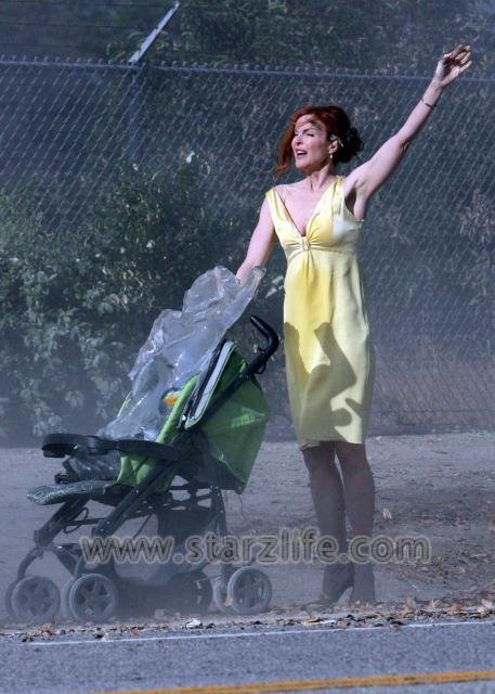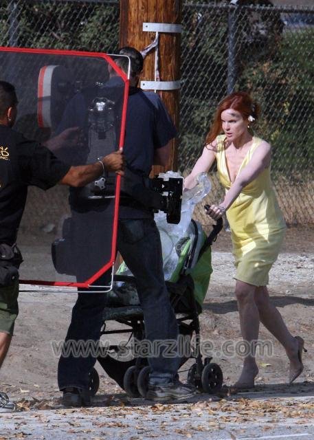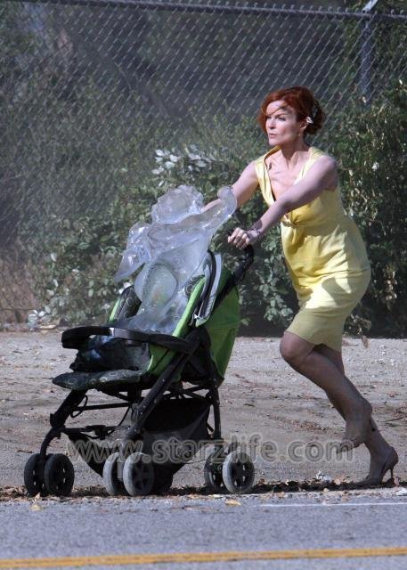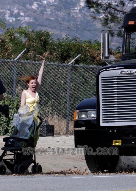 050308_sl_cross05.JPGMarcia Cross was trying to hitch a ride from a Semi-Truck  in Hollywood this past weekend for her and her ice sculpture?  But don’t worry, she was just shooting a scene for an upcoming episode of Desperate Housewives.  More photos and possible scene spoilers after the cut. I’m not exactly sure what is brewing up on the final few episodes of season 4 of Desperate Housewives,  but they better have something big planned to compete with the fact that Lindsay Lohan is guest starring on the finale of Ugly Betty.Not that there is any comparison and DH clearly wins in overall ratings, but sometimes you just have to find space for linkbacks!In these pics Cross seems to be stranded out by a highway while pushing a stroller carrying what appears to be a cupid shaped ice sculpture, constantly getting dust and leaves kicked up on her.  Dirty is definitely not a word associated with Bree VanDeKamp.  It will be interesting to see how this one pans out.050308_sl_cross15.JPG050308_sl_cross17.JPG050308_sl_cross19.JPG050308_sl_cross24.JPG