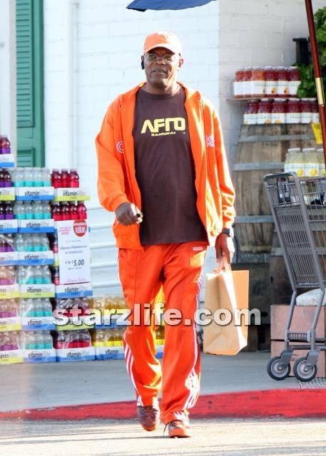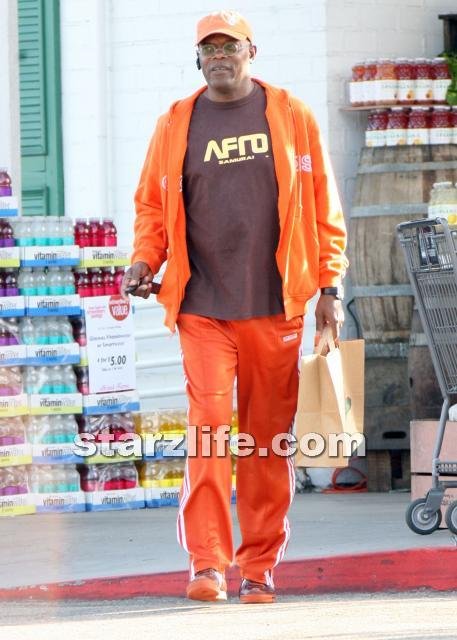 Samuel L Jackson went grocery shopping in Hollywood this week wearing this (coordinated) orange and brown mess. Two more pics after this. I can’t even think of a joke that describes this outfit!