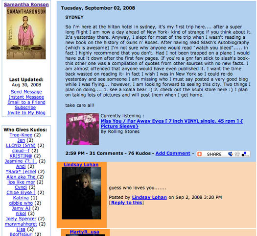 I swear these two are trying to make their Myspace pages the hottest sites on the internet. Somehow…It’s working. Sam Ronson is off to Australia for a DJ gig and posted a little goodbye message to her fans (people who go to her page to read about Lindsay.) You’ll never guess who the first reply was.