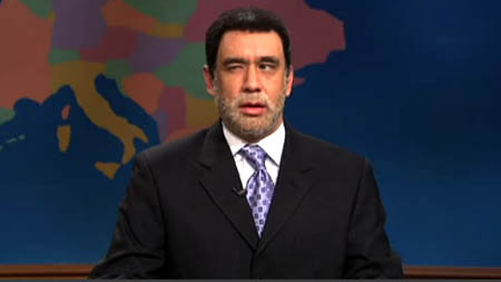 In the sketch, Armisen kept his right eye mostly closed while keeping his left eye wandering around the room. During discussion of filling Hilary Clinton’s senate seat, he held the chart upside down.