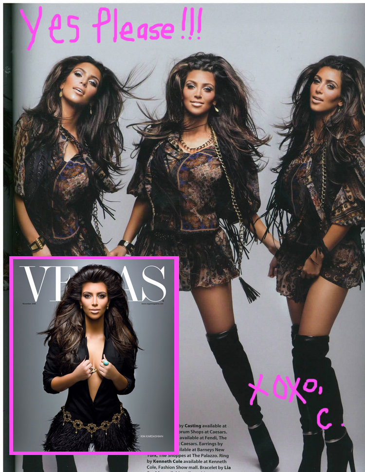 Kim Kardashian shared some photos from her shoot in Vegas magazine on her blog and while I thought the only thing better than Kim Kardashian could be two Kim Kardashian’s, look how good three Kim Kardashian’s looks!