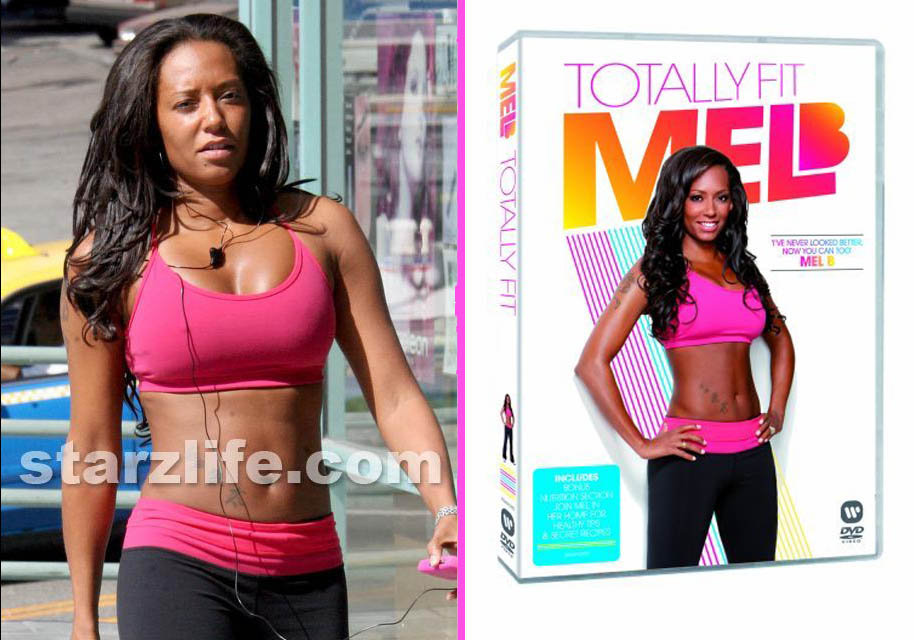 Left: Mel B. heading to a West Hollywood tanning salon. Right: Mel B on the cover of her workout DVD, Totally Fit.
