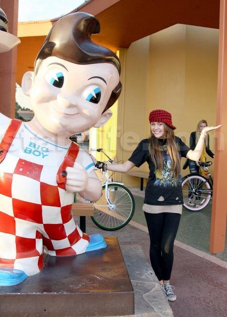 Miley spent yesterday evening on a bike ride in the Valley with her sister Brandi. The girls stopped by Bob’s Big Boy and Miley posed with the statue out front. Naughty Miley continued to disobey that pesky helmet law, and continued to chat away no her celly while riding down the street. Poor Brandi!