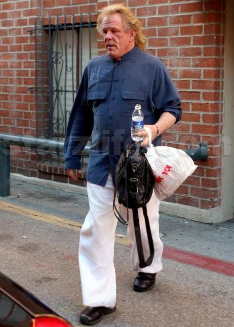 A Very haggard looking Nick Nolte running errand and carrying a man-purse.