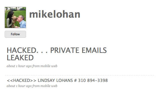 Michael Lohan pretty much first showed up in the Twitter world this morning, and already he’s been hacked.
