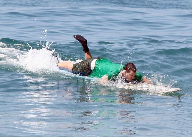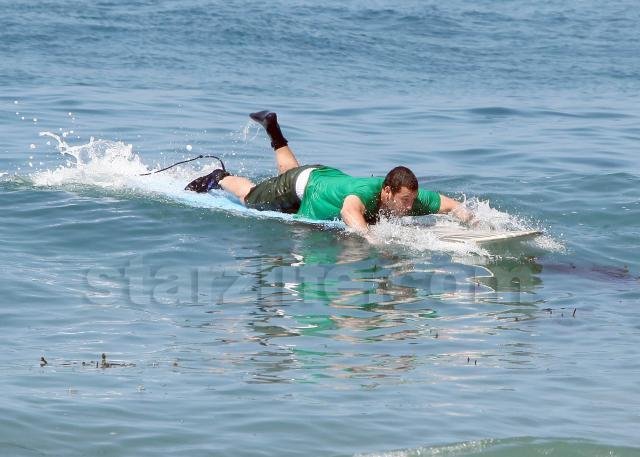 The 42 year-old star of ‘Funny People,’ and father of two, clad in a body-concealing t-shirt, played around with his board but didn’t actually quite make it upright.