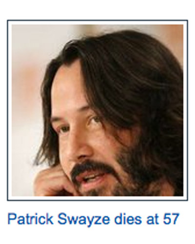 I’ll admit that I’m in no position to make fun of other bloggers switching up a picture – I’m guilty of it myself – but I mixed up two pics of actresses playing the same character. Keanu Reeves and Patrick Swayze don’t even look anything alike. And they really don’t now.