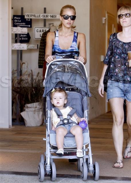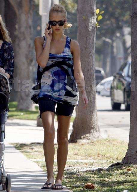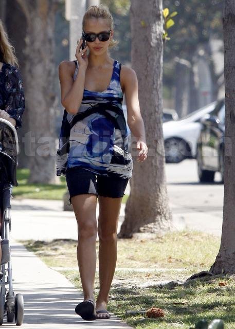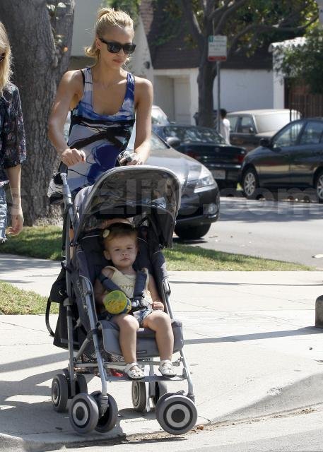 Jessica, minus the smile as usual must keep in that tip top shape by pushin that baby around town every day as she shops til she drops!