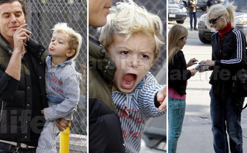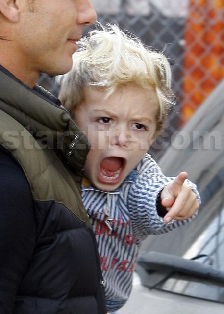 While little Kingston, who is easily the most fashion forward celeb-u-tot out there was screaming “paparazziiiii!” and taunting the photogs by sticking his tongue out at them, he managed to direct some spit right at Gavin’s face.