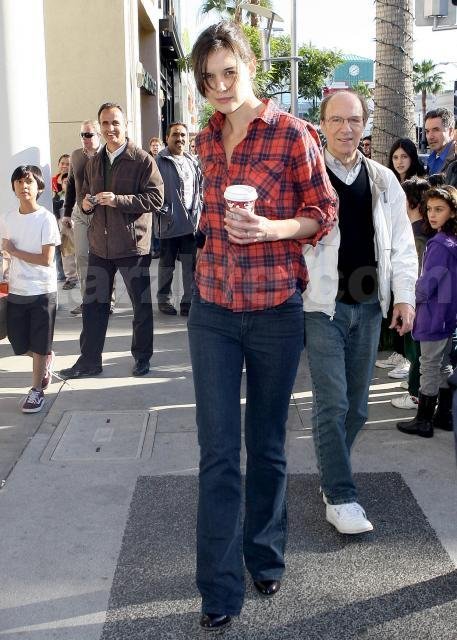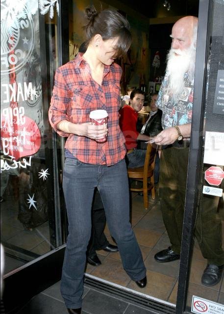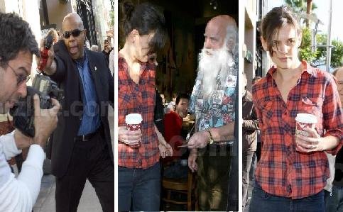 Damn! Katie Holmes stopped into Starbucks to chat with an off-duty Santa Claus (see pics) when a bunch of paparazzi started taking her picture because she’s really, really famous. Her bodyguard went all jogger-fighting-off-rapist on one of them and straight up busted out the pepper spray. Starzlife was there, but our eyes aren’t bleeding because we dodged the miasma of toxic death-spice.