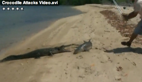 This poor shark gets it from both ends. After he’s caught by some Aussies and reeled onto the shore, a damn crocodile swims out of the water and tries to eat it. And you know Australia’s a tough country, because the guys trying to kill the shark barely react. In fact, the guy filming the whole thing doesn’t even bother to say, “Hey, look out for that crocodile” as he pans the camera to make sure it’s in frame. It’s like he was hoping it would eat a few guys because he knew that would get a billion YouTube views. Then, after they they whack the croc on the head and it runs away, they laugh. I guess the crocodile does run kind of funny.