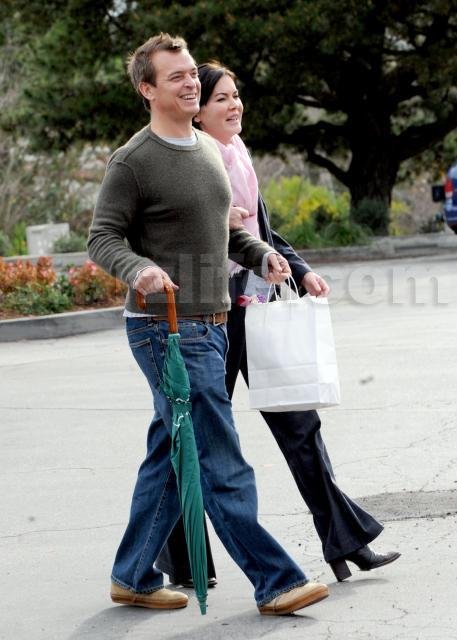 Hmmm boy. Lara Flynn Boyle sure is looking different these days. The actress, best known for her stint on The Practice and more recently seen in Life Is Hot in Cracktown, went for a stroll with husband Donald Ray Thomas II, a real estate investor. Nice umbrella, dude. It’s a clear, bright, California sunshine day, but at least you’re prepared if a musical breaks out. Back to Lara, is homegirl on the same steroid regiment that Jerry Lewis took a few years back? Switch to creatine.