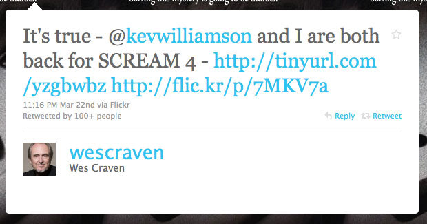 That question was answered this morning when Craven posted the following to his Twitter page. Yes, even Wes Craven tweets!