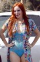 As usual, Phoebe paraded around the streets for all the photographers wearing a blue knit bathing suit that clearly shows off her camel toe, and a shirt that looks like it came out of the closet of Ace Ventura. Enough to make anyone’s eyes bleed.
