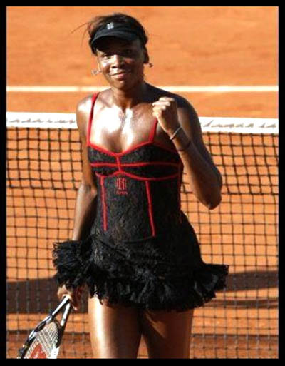 Williams defeated Patty Schnyder 6-3 6-3 in dual sets wearing this little red and black lace number that may have gotten the crowd a little more revved up.