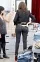 Slimming poses, covering her belly region by a huge shopping bag, loose fit shirt.