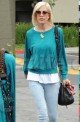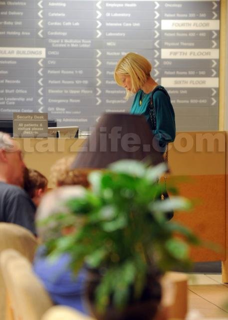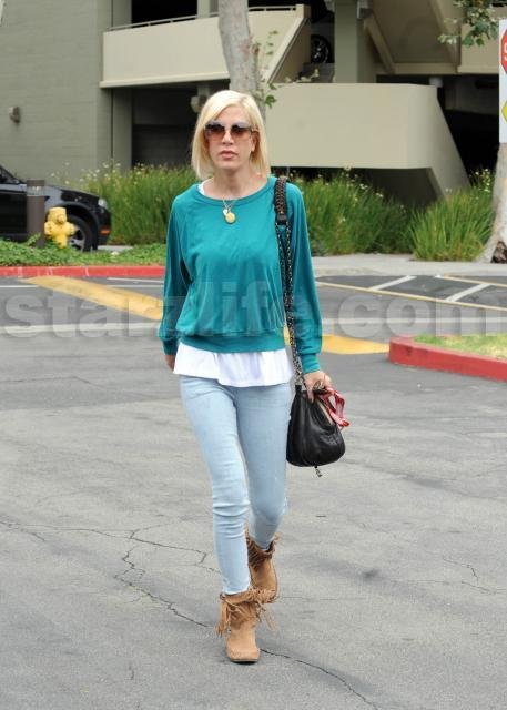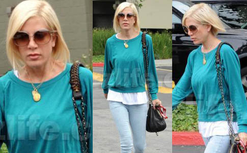 We spotted Tori Spelling arriving at the hospital where husband Dean McDermott has been cooped up after his motorcycle accident, looking sad of the circumstances, with children Stella and Liam in tow.