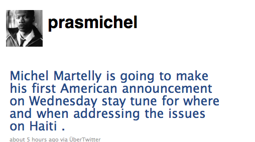 Wyclef’s former Fugees bandmate, Pras Michel has taken to twitter to actively endorse Wyclef’s opponent in the upcoming presidential elections in Haiti. Wyclef announced earlier this month that he’s running for the presidency and Pras isn’t the only one with doubts about his motives, Sean Penn has voiced skepticism as well. You might remember Pras from his post-Fugees hit Ghetto Superstar. Pras’ twitters seem to be escalating by the minute including inflammatory tweets like “Wow!!! This driver is trying to get me kill I wonder am I being set up by the opposition ????”