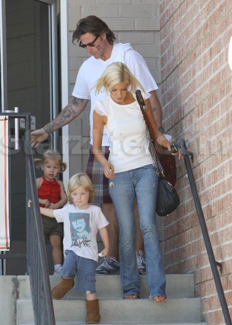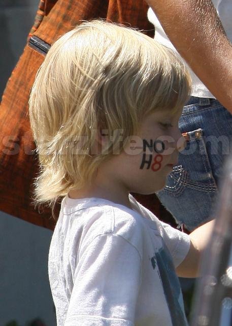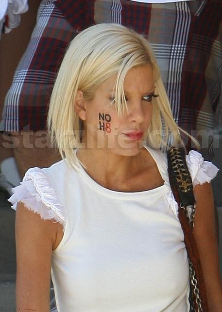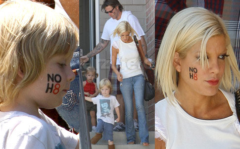 Tori Spelling and her family say No to Prop 8 by saying yes to face paint. The whole family went and got the NOH8 message painted on their cheeks in Los Angeles today. Permission to marry after proposition banning gay marriage was overturned, has been postponed for another week. We’ll see if Tori and family can keep the face paint on that long.
