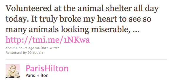 Someone needs to tell Paris that it’s only volunteering if you have a choice and Paris doesn’t. She does however have about 200 hours of community service to work off as part of her sentence for cocaine possession. Over the next few months we’re more than likely going to see Paris Hilton tweeting a lot about her “volunteering” with worth while causes. As she tweets about helping animals and sick children, keep in mind, she is not helping out of the goodness of her heart but helping herself stay out of jail.