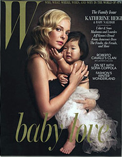 October was the month of break-ups, from Cox to Cyrus to Lopez, every day there seemed to be a new celebs split. Thank God it’s over and we’re on to November, which is looking like it can go two ways, the month of celebs nudes or the month of babies. Luckily W Magazine has all the bases covered in their new Family issue. The magazine features celebs moms and their offspring including Modonna and Lourdes, Katherine Heigl and her daughter Naleigh, Jenna Jameson and Usher with their families. There’s nothing like turning your models in to moms to take the edge out of an issue, so to get it back model Miranda Kerr appears naked and six month pregnant with husband Orlando Bloom’s baby.