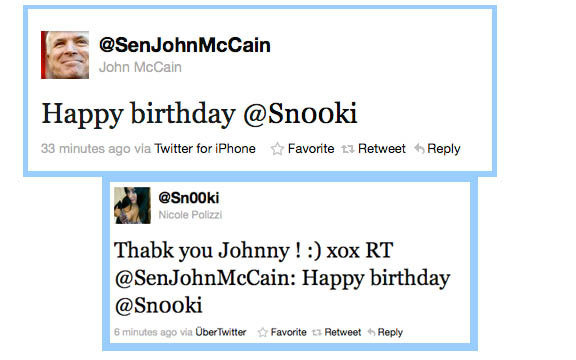 John McCain tweeted Snooki a happy birthday this afternoon, (it’s November 23) and she replied with a “Thank you Johnny!”