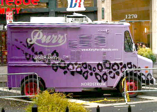 Katy Perry released her new fragrance called Purr in the US today by touring NYC in a branded purple ice cream truck making several stops all over the city. The perfume comes in a big purple bottle shaped like a cat… classy. The whole Purr, Purrfume, Purrple theme offers all the depth as her lyrics, but Hightlights readers should have fun making the connection and more than likely will pick a bottle of the stuff if they save enough allowance before next summer. If not, Justin Bieber’s perfume will be out then and tweens will have some tough decisions to make regarding the way they smell in the future.