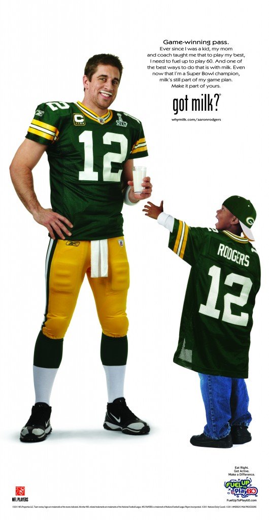 Rodgers is the 14th annual Super Bowl MVP that has debuted a Milk Mustache ad on the Monday after the big game in the USA Today, and his ad copy reads: “Games-winning pass. Ever since I was a kid, my mom and coach taught me that to play my best, I need to fuel up to play 60. And one of the best ways to do that is with milk. Even now that I’m a Super Bowl champion, milk’s still part of my game plan. Make it part of yours.”