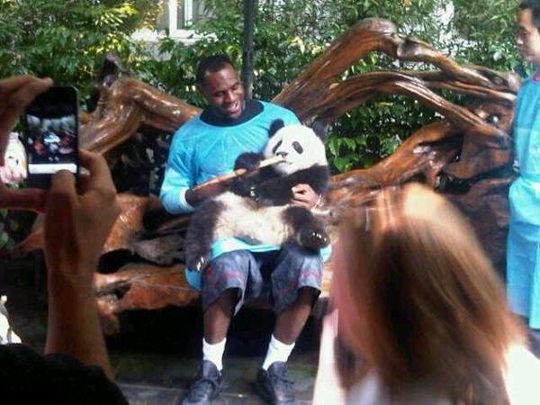 LeBron James is on a world wide promotional tour this summer, and has recently been in China, promoting shoes, playing ball with the locals, and coddling Pandas?