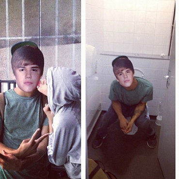 Rihanna uploaded a couple of photos of her Bieber fever to her Twitter account on Monday, by slapping a Bieber mask on her photographer and posing her in a bathroom stall.