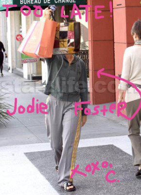 Whoa baby! What the heck is Jodie Foster wearing? Jodie was out getting groceries in West Hollywood this afternoon when we spotted her wearing that hot mess of a dress and Jesus sandals. Check out the StarzLife Exclusive! photos after the bump, uhh, I mean…after the jump.