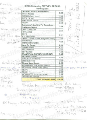 By now you’ve seen the set list that BritneySpears.com released today for the Circus Tour which starts TOMROROW! But StarzLife is EXCLUSIVELY bringing you the show notebook for the circus, which will outline you the show in it’s entirety. It’s packed with a bunch of scribbles , but it would appear that Prodigy’s Firestarter, Annie […]