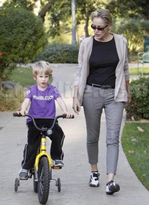 Sharon Stone spent some time with her son Roan this past weekend while he learned to ride his bike. Sharon walked along side as he peddled the bike still with training wheels and instructed him on using the breaks.