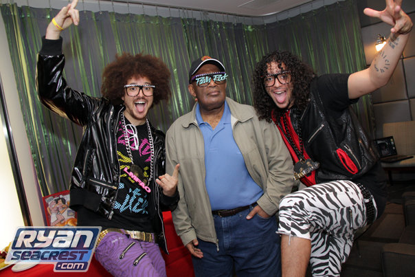 Old man weather, Al Roker, is in LA bitch! Here Al Roker chats it up with party rock group LMFAO in Ryan Seacrest’s green room. Al looks thrilled! Looks like he’s never been to their neck of the woods… Image via: Ryan Seacrest